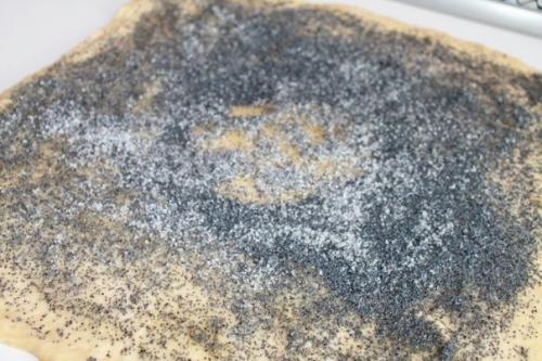 Равномерно распределяем сахар и мак на поверхности теста. Скатываем в рулет.