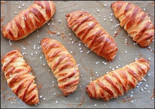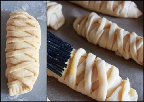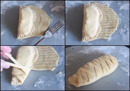 А потом наши нарезанные полоски загибаем на булочку. Можно просто ровно, можно крест на крест.
