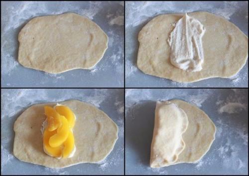 На творог - персики. Укрываем одним концом теста. Края слегка прижимаем вилкой, как на картинке.