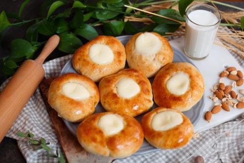 13. смажьте заготовки взбитыми яйцами. 14. Добавьте в углубления сметанный крем (по 1 ст. л. ) и равномерно распределите. 15. Заготовки на подготовленный противень переложите. 16. выпекайте при 220\xB0C 18-20 минут.