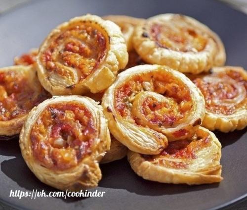 Мы раскатываем тесто в прямоугольный пласт. Натираем сыр на крупной тёрке, а ветчину нарезаем тонкими пластинками. На прямоугольный пласт теста распределяем сыр, поверх него укладываем пластинки ветчины и посыпаем укропом. Аккуратно сворачиваем в рулет и нарезаем на кусочки.