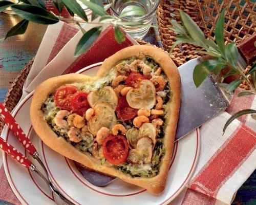 2. на тесто разложи начинку: колесики помидора, поджаристого репчатого лука, обжаренные на раскаленной сковороде креветки, ломтики салями, листики шпината, кубики ананаса - короче, все, что любит ваша семья.