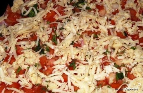 Затем щедро посыпаем пиццу слоем тертого сыра. При желании можно посыпать зеленью.