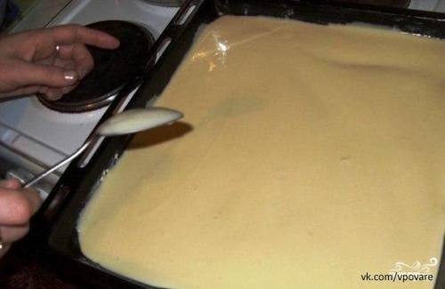 Смешиваем яйца, майонез и муку. Хорошенько перемешиваем. Получившееся тесто выливаем в форму для запекания.