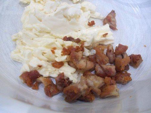 2. с куриного окорока снимем мясо, которое пожарим до золотистости и отправим в тарелку к плавленому сырку.
