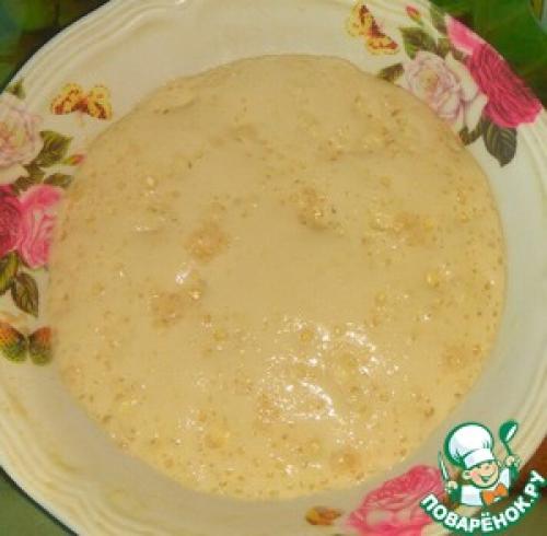 В 100 мл теплого молока развести дрожжи, 1 ч л сахара и 1 ст л муки от общего количества. Оставить в теплом месте.