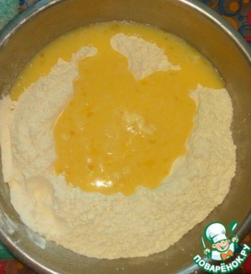 Шаг 3. В муке делаем углубление, куда выливается жидкая смесь. Шаг 4. Начинаем замес теста. Для начала внутренняя часть муки просто смешивается с водой. Медленно в нее добавляем сухой продукт. Далее замешивать можно руками. Если ваш стол небольшого размера и вода может разлиться по краям, замешивайте тесто в миске большого размера. Тесто соберется в шарик. Стол в итоге должен остаться чистым.