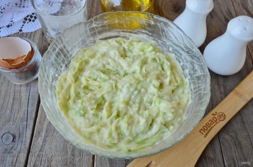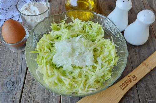 2. кабачки натрите на крупной терке и отожмите сок. Добавьте к ним тертую луковицу, ее я тоже обычно тру на крупной терке. Перемешайте.