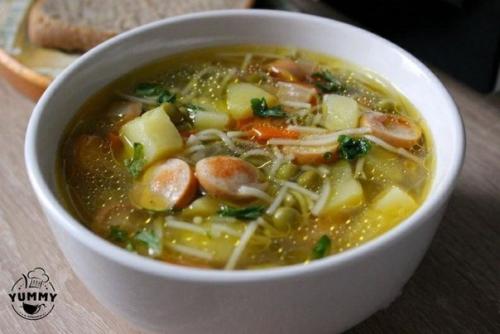 В кипящую посоленную воду положить порезанный картофель. Лук и морковь порезать, спассеровать на растительном масле. Добавить в пассеровку порезанные сосиски, обжарить. К картофелю добавить горсточку тонкой вермишели, дать закипеть. Затем добавить пассеровку с сосисками и зеленый горошек. Варить пару минут. Добавить лавровый лист, черный перец. Через минуту снять с огня. Приятного аппетита!
