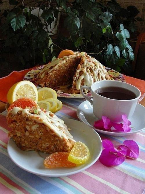8. выложить массу на блюдо и сформировать Горку. Украсим мармеладками, орешками и растопленным шоколадом. Убираем в холодильник на застывание на пару - тройку часов.