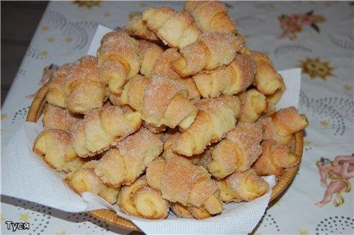 . сахара (можно сахар перемешать с корицей), положить кусочек теста на сахар и раскатать лепешку 5-6 мм толщиной. Порезать на сегменты и каждый сегмент завернуть рогаликом. Можно сделать с начинкой, я брала конфеты джелли или любые мармеладки, ложила на сегмент и скручивала. Уложить на противень и выпекать минут 20 до золотистого цвета. Приятного аппетита!