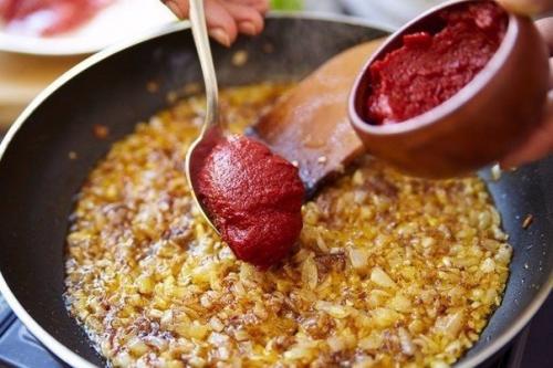 5. добавить аджику, томатную пасту, перемешать.