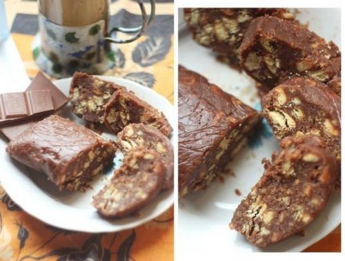 Чайной колбаской! Даже не ожидала, что это настолько вкусный десерт! Поскольку печенье надо крошить не до конца, его кусочки чувствуются в колбаске и аппетитно хрустят. Всем советую попробовать! Готовится считанные минуты, а удовольствия море!
