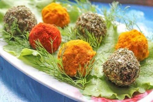 Обмакивая ладони в воду и отделяя небольшие части от плавленной массы, скатайте их в форме небольших шариков. Опустите шарики в подготовленные приправы и как следует обваляйте их в них.