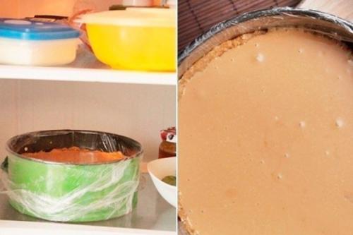 Форму для запекания выстилаем пищевой пленкой, выкладываем на нее основу и аккуратно разравниваем ее по всей поверхности формы, делаем бортики. Выливаем на основу приготовленную массу из сгущенки, творога и сливок. Теперь ставим чизкейк в холодильник минимум на 4-5 часов, а лучше на всю ночь.