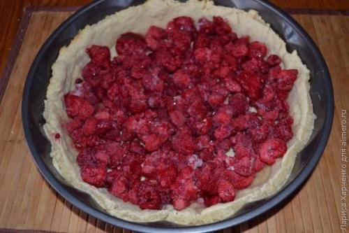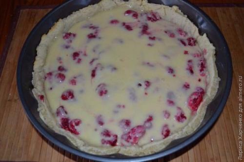 9. теперь осталась самая малость - распределить слегка подтаявшую малину по дну формы на уже выложенное тесто и залить ее сметанной заливочкой.
