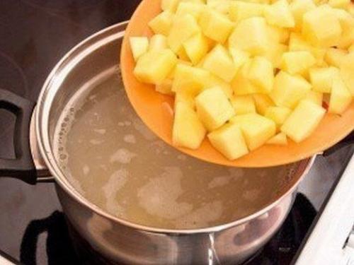 Варить 5-7 минут. Затем добавить мясо, варить до готовности картофеля.