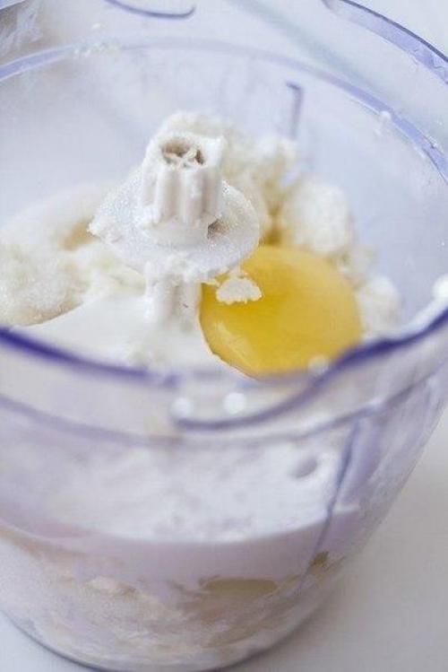 3. для начинки творог смешать с сахаром и сметаной. Я это в блендере делаю. Яйцо пригодится, если необходимо скрепить жидкую массу. Но тогда начинка будет совсем другая на вкус, по типу творожной запеканки. Делала оба варианта, больше нравится без яйца.
