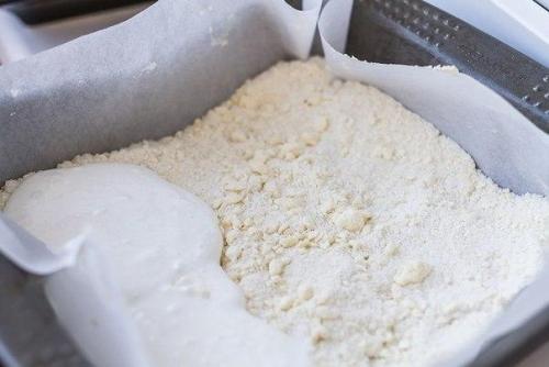 4. форму для пирога застелить пергаментом. Насыпать половину песочной крошки, сверху выложить начинку. Засыпать оставшейся крошкой. Выпекать при 200 градусах 30 мин.