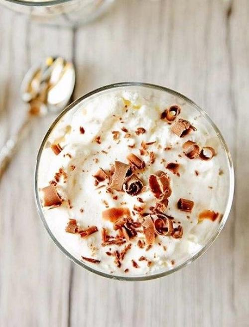 Верх десерта украсьте крошкой из шоколада (сделать это легко с помощью ножа или для чистки овощей.