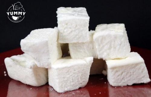 3. помещаем на час в холодильник. А затем можно нарезать на кубики, прямо в форме. Извлечь из формы можно руками или при помощи лопаточки. Диетический маршмеллоу готов?