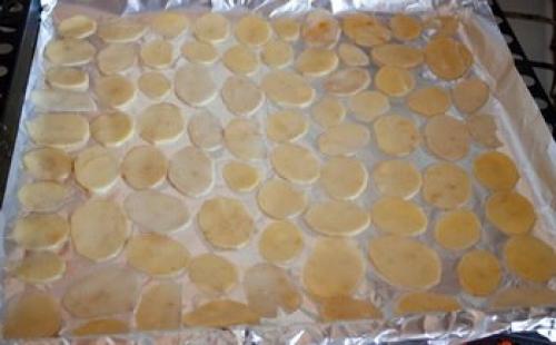 Картофель мы на ломтики толщиной 2-3 мм нарезаем. Кладем картофель в миску, добавляем 1 ст. л. оливкового масла, паприку, кайенский и черный перец. Солим и перемешиваем. Застилаем фольгой 2 противня. Фольгу смазываем оливковым маслом. В один слой укладываем картофельные ломтики