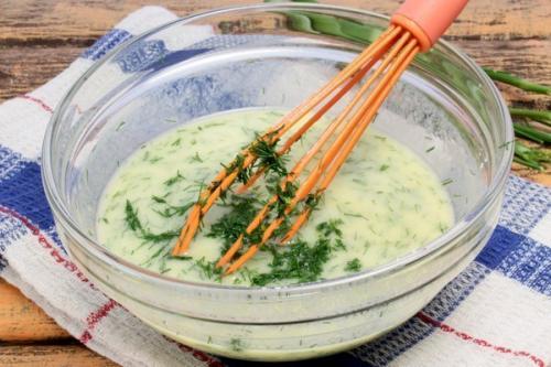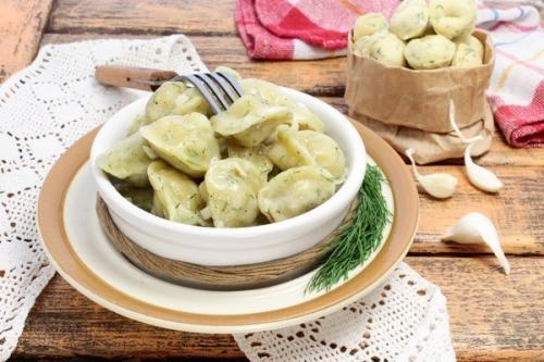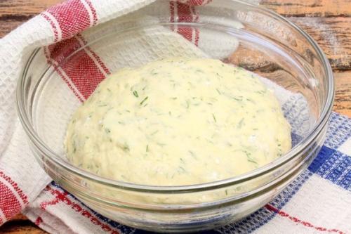 Для этого вида пельменного теста на кефире выбирайте молодой и сочный укроп, тонкие ветки которого легко и равномерно распределяются внутри довольно плотной мучной массы.