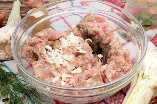 3. мясной фарш посыпаем солью, молотым черным перцем, добавляем измельченные репчатый лук и зубцы молодого чеснока. Заранее запариваем пару листов лавра примерно в 50 мл кипятка. Слегка остудив, раствор переливаем к фаршу и основательно вымешиваем. Пряный аромат усилит вкус и подарит начинке сочность.