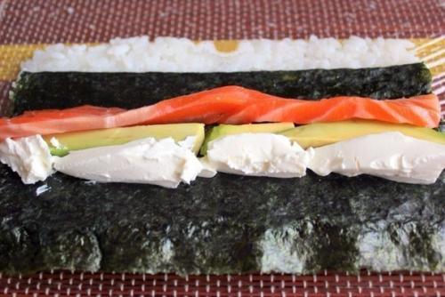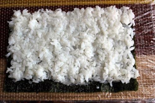 Авокадо очистить и нарезать вдоль на кусочки (так же можно использовать огурец, который тоже нарезать продольно. Коврик Макису или салфетку - циновку нужно обязательно обернуть пищевой плёнкой, так будет намного удобнее. Стандартный лист нори разрезать на 2 половины и положить блестящей стороной на циновку. На нори выложить тонкий слой риса следующим образом: с одной стороны оставить 1, 5 см нори без риса, а с другой стороны, так сказать, выехать рисом тоже на 1, 5 см. Примечание: перед тем как взять рис, руки нужно смочить в воде с уксусом.