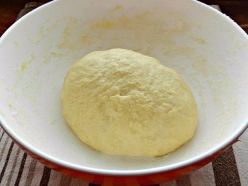 Взбить яйцо с сахаром, ванильным сахаром и солью. Влить теплое молоко, перемешать. Муку смешать с сухими дрожжами и, добавляя постепенно, в яично - молочную смесь замешивать тесто сначала венчиком, потом руками. В последнюю очередь добавить растопленное сливочное масло и вмесить его в тесто. Тесто должно однородным и мягким получиться. Накрыть миску с тестом пищевой пленкой или полотенцем и убрать в теплое место для подъема на 1-1, 5 часа.