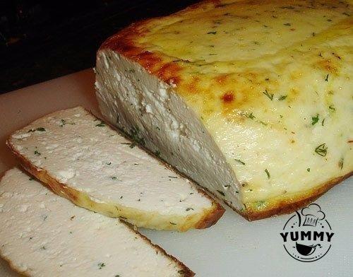 По желанию можно выстелить марлей форму, выложить отцеженный сыр, придавить тяжелым грузом и поставить в холодильник на 3-4 часа. Для запекания в духовке, смазать сыр взбитым желтком и поставить в предварительно нагретую до 225 с духовку на 10 минут, до золотистого цвета. Травки добавить, под грузом держать всю ночь, затем в холодильнике тоже под грузом весь день, запекать 13 минут, и вот, что получилось. Приятного аппетита!