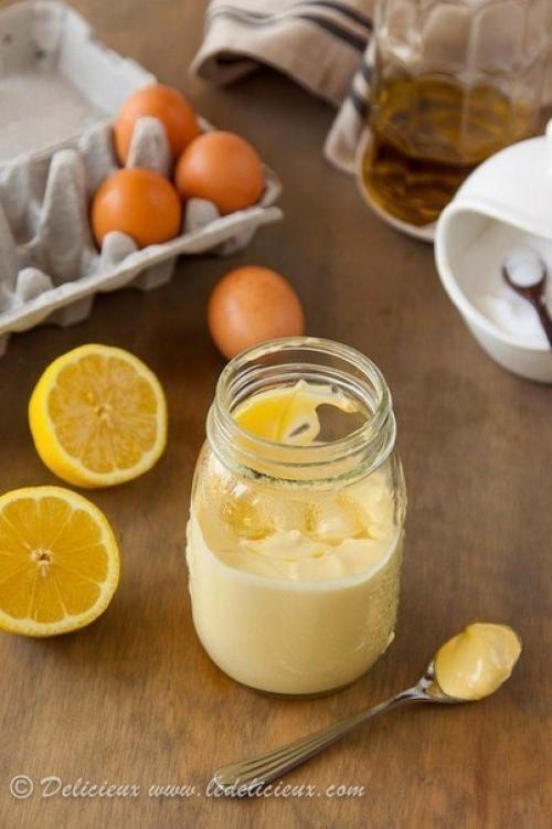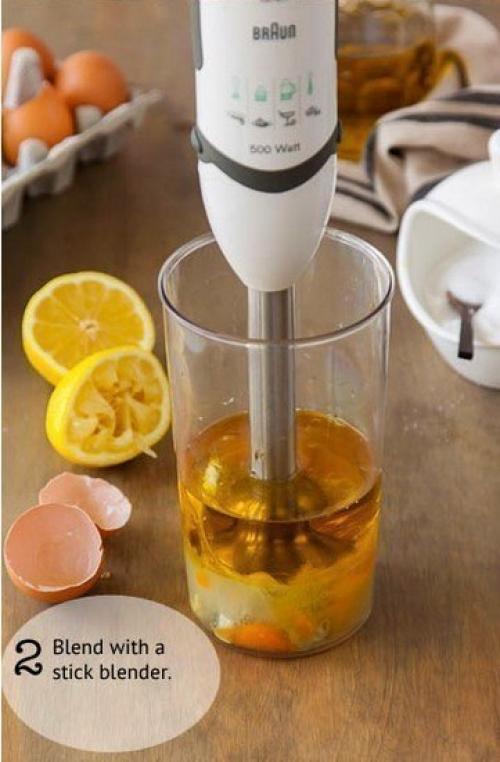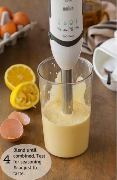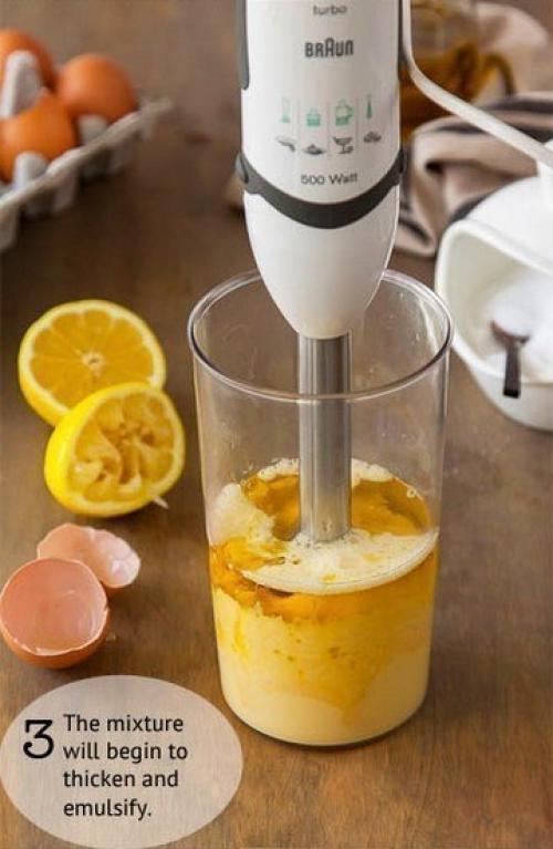 Ингредиенты:- 2 яйца.- 3 столовых ложки лимонного сока.- 1 чайная ложка дижонской горчицы.-1/2 Чайной ложки соли.- Перец по вкусу.- 1, 25 стакана оливкового или другого масла.
