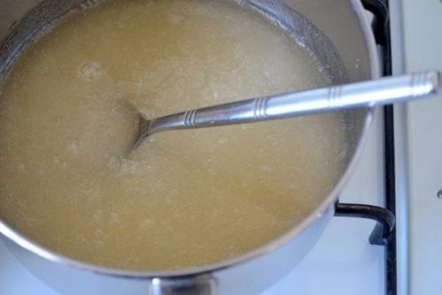 2. предварительно замоченный агар поставить на огонь и довести почти до кипения, чтобы он растворился. Всыпать сахар (475 г) и хорошо перемешать. Варить сироп на среднем огне, пока лопаточка, поднятая из сиропа, не потянет "Сахарную Нитку". Оставить сироп, чтобы он слегка остыл.