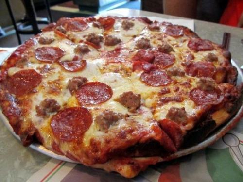 Растягиваем собравшееся тесто, так чтобы дотянуть до самых бортиков и делаем небольшие загибы по краю. Теперь смазываем тесто кетчупом и выкладываем начинку в таком порядке: лук, колбаса, грибы, перец, сыр. Сверху делаем сеточку (как можно тоньше) из майонеза и выкладываем помидоры. Запекаем 10 минут. Духовку сначала разогреть до 2300. Достаем пиццу и накрываем ее ненадолго кухонными бумажными полотенцами и даем постоять 5-6 минут. Режем на порции и украшаем петрушкой. Такая пицца в духовке, да еще и если приготовить тесто саморучно, будет вкусной и в холодном виде, и пролежит не один день (хотя это, наверное, вряд ли.