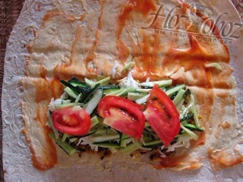 На одну сторону лаваша укладываем мясо, сверху аккуратно посыпаем капустой.