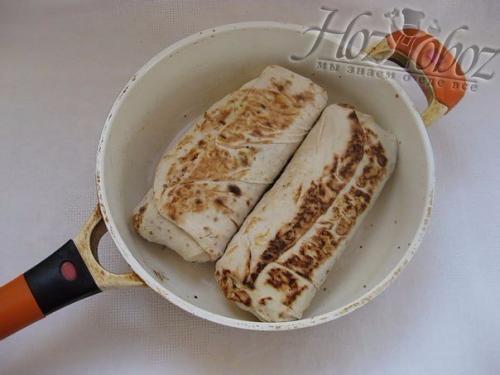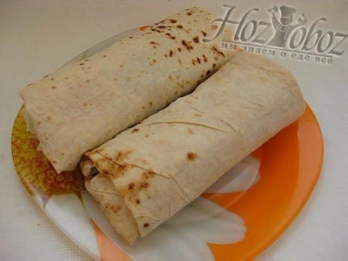 Сворачиваем сначала длинные края лаваша, а затем полностью скручиваем его в рулет.