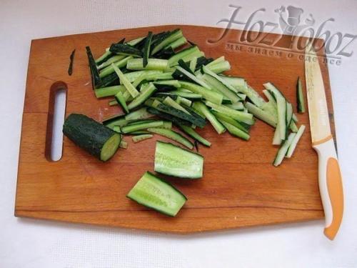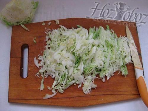 Капусту порежем тонкой соломкой и немного прижмем с солью.
