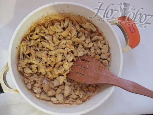 В разогретую сухую сковороду положим порезанное мясо, добавим приправу Карри и поджарим до золотистого цвета. В конце приготовления соль и перец добавим.