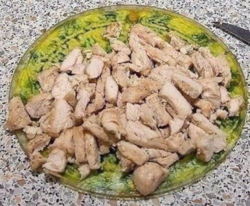 4. остывшую курицу режем при необходимости, измельчаем зелень.