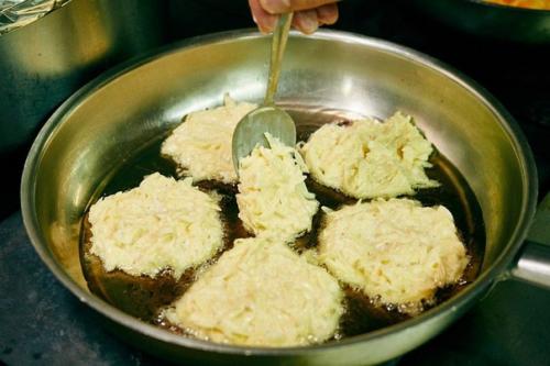 3. на разогретую с растительным маслом сковороду выкладывать картофельную массу столовой ложкой. Обжаривать на умеренном огне по 5 минут с каждой стороны до румяной корочки.
