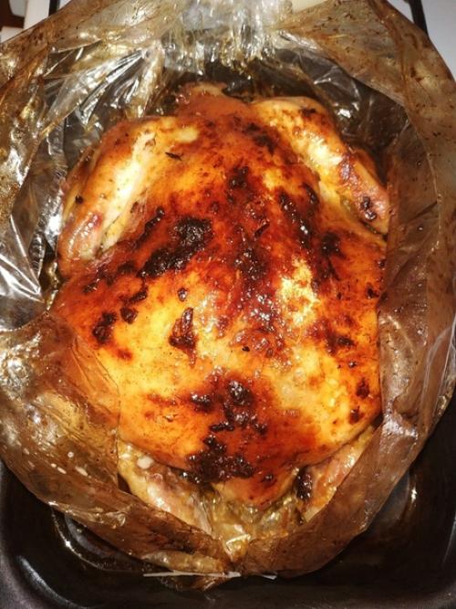 Запекать в заранее разогретой духовке грудкой вниз при 200' 40 минут, затем пакет разрезать, сверху смазать сливочным маслом и запекать ещё 30-40 минут, убавив темп до 170'.