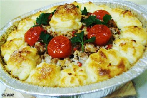 На пюре Горкой выложить фарш. С помощью шприца по ободку формы отсадить розетки из пюре, которые присыпать небольшим количеством мелко натертого пармезана.