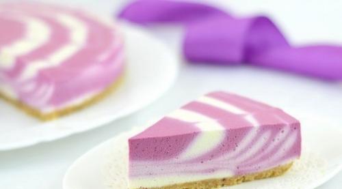 Торт перетащить на бумаге на большую тарелку или доску, затем аккуратно вытащить бумагу из-под торта. Творожный торт приятного сиреневого цвета и нежного ягодного вкуса получается.