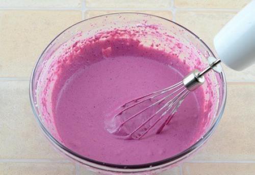 Третью часть творожной массы отложить в другую емкость, добавить ягодное пюре и дополнительно 2 столовые ложки сахара (если ягоды совсем не кислые, сахар можно не добавлять. Взбить.