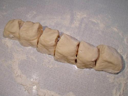 Хорошо вымесив тесто, делим его ножом на 3-4 части, после чего каждую из них скатываем в продолговатые "Колбаски", которые нарезаем небольшими кусочками.