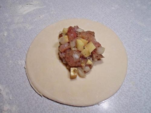 Для начинки нам потребуется мясо, картофель и лук приблизительно в равных пропорциях. Лук и картофель очистить, вымыть и нарезать равными кубиками, размером чуть больше горошины.