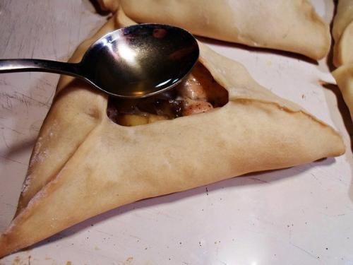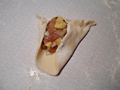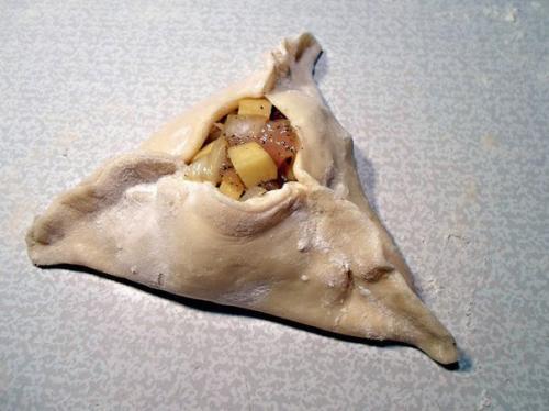 В середину каждой лепёшки из теста нужно положить начинку и аккуратно придать форму треугольника, защепив края с трёх сторон, оставив центр свободным.