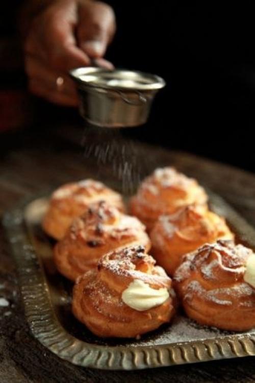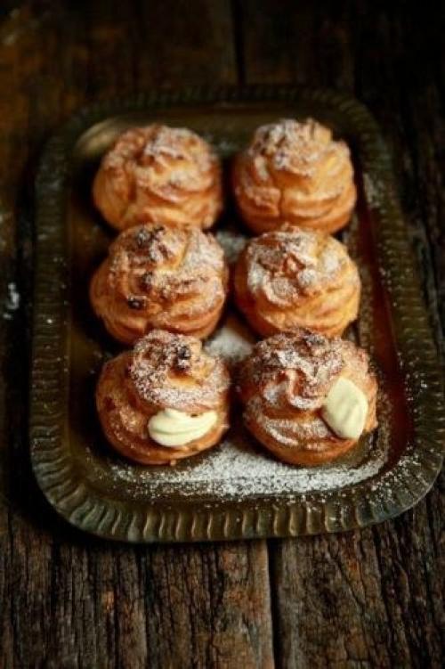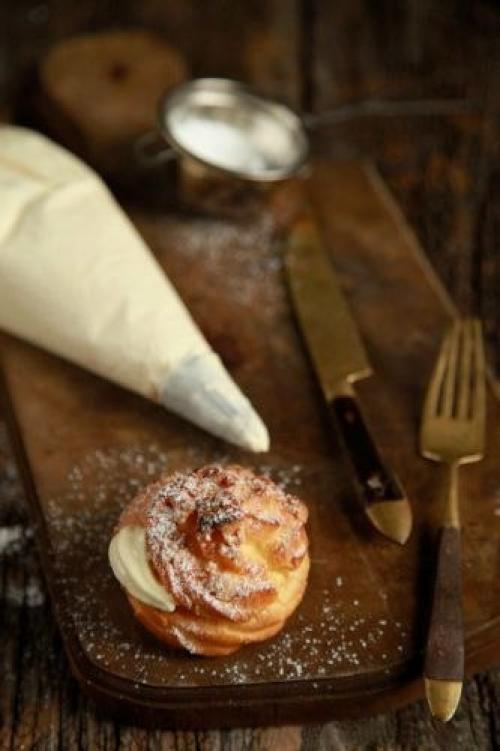 9. взбейте сливки со второй половиной сахарной пудры, добавив немного ванильного сахара, до устойчивых пиков. Смешайте оба крема до однородности. 10. Эклеры осторожно надрежьте и при помощи кондитерского шприца наполните полученным кремом.
