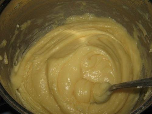 В кастрюлю налить воду, положить масло или маргарин, соль, поставить кастрюлю на огонь и довести до кипения. Когда вода с маслом закипит, снять с огня и постепенно всыпать просеянную муку, интенсивно размешивая тесто широкой деревянной лопаточкой. Снова поставить кастрюлю с тестом на слабый огонь и растирать тесто до получения гладкой блестящей массы (тесто должно легко отставать от стенок и дна кастрюли).