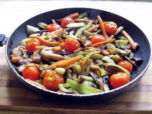 3. на гарнир у меня овощи. Конечно, состав каждый раз разный. Сегодня это - кабачки, баклажаны, сладкий перец, морковь и помидоры.